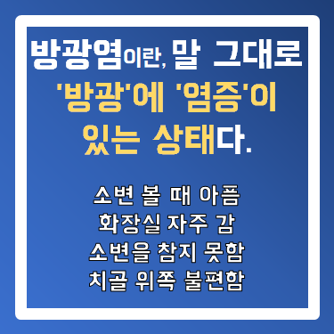 ‘방광염’이란? 말 그대로 ‘방광’에 ‘염증’이 있는 상태를 의미합니다. 염증 때문에 배뇨통, 빈뇨, 절박뇨 등의 증상이 나타나기도 하고 하복부~치골 위쪽의 불편감까지 있기도 합니다. 쉽게 말하면, 소변과 관련된 증상이 있을 때 흔한 질환 중에 하나가 ‘방광염‘이다라고 생각하시면 됩니다.